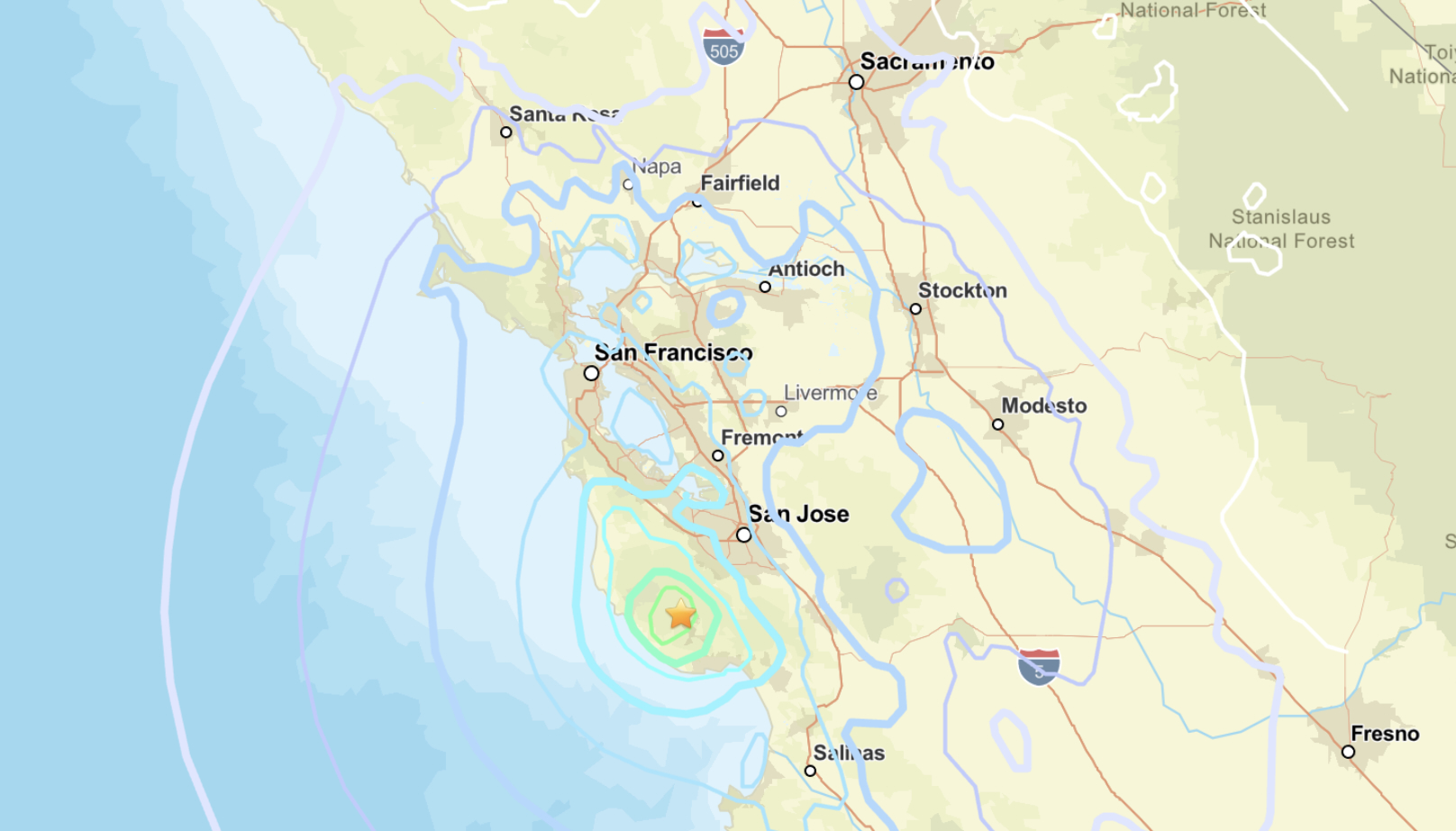 Light-to-moderate shaking was felt throughout the Silicon Valley, with movements experienced past Fairfield, to the northeast, and Soledad, to the southeast, the USGS reported.