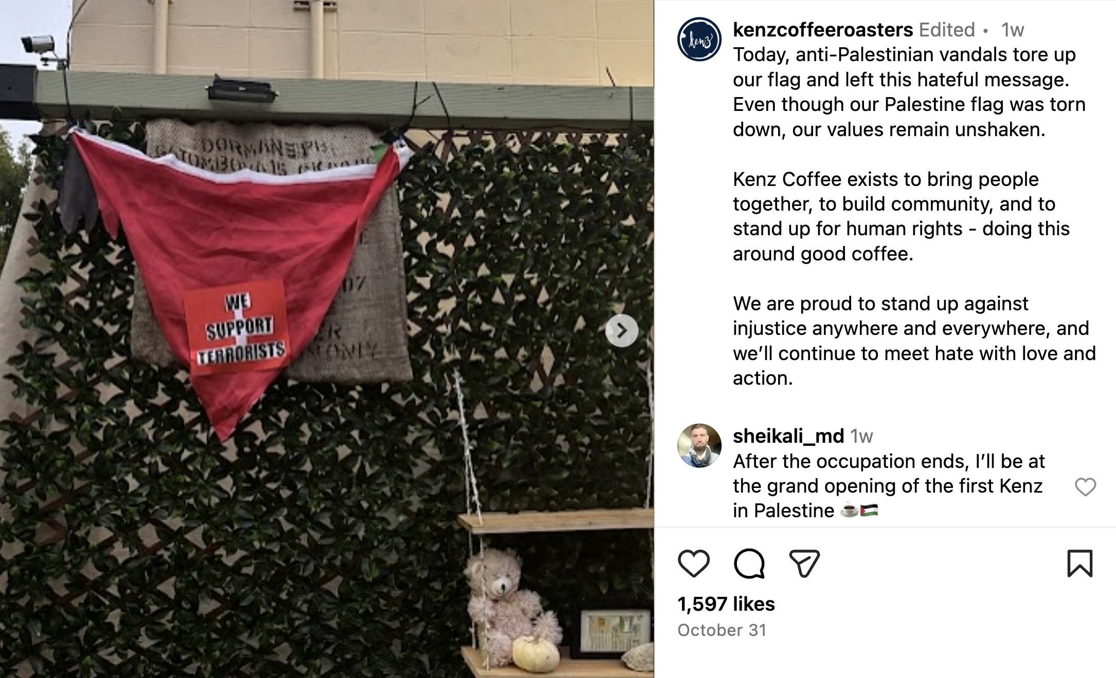 “Today, anti-Palestinian vandals tore up our flag and left this hateful message. Even though our Palestine flag was torn down, our values remain unshaken,” the business wrote on Instagram, alongside a photo showing the words “WE SUPPORT TERRORISTS” had been left on the remainder of the flag. “Kenz Coffee exists to bring people together, to build community, and to stand up for human rights—doing this around good coffee. / We are proud to stand up against injustice anywhere and everywhere, and we’ll continue to meet hate with love and action.”