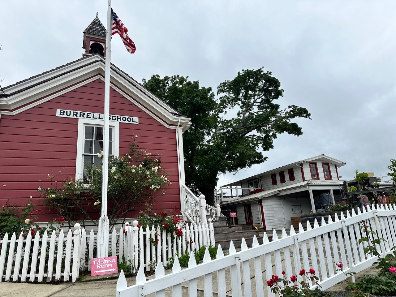HISTORIC - The 1879 Burrell Schoolhouse on a cool, drizzly day in April. Roses were planted by the late Anne Moulton, whose rose garden in the back of the schoolhouse is legendary. (Laura Ness / Los Gatan)