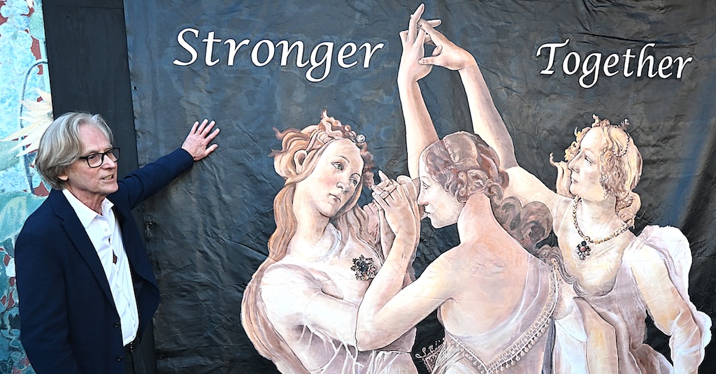 The artist behind this temporary mural, which went up last Friday is internationally renowned figurative artist John Peck. Within this mural, he conveys the spirit of Los Gatos and LGCRC. With his capable brushstrokes, he painted “Stronger Together” in just 27 days.